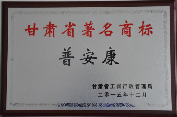 甘肅省工商行政管理局依據專家組認定意見作出決定,認定我公司“普安康”商標為甘肅省著名商標,公示期滿后于2015年12月給予公司頒發了《甘肅省著名商標證書》。