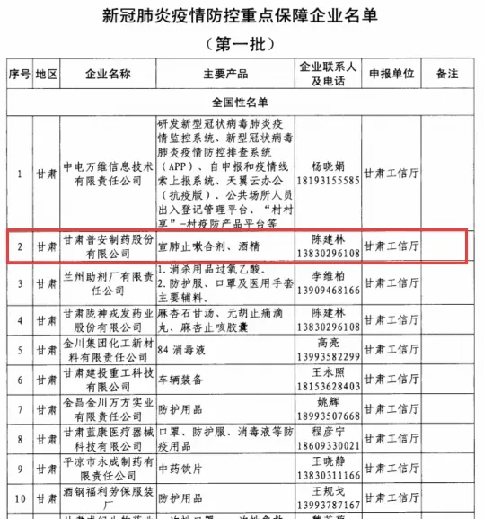 喜訊:甘肅普安制藥股份有限公司榮列國家新冠肺炎疫情防控重點保障企業名單(第一批)