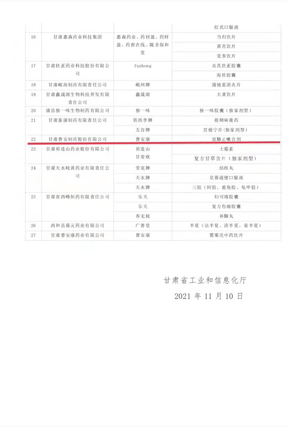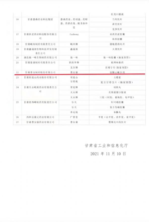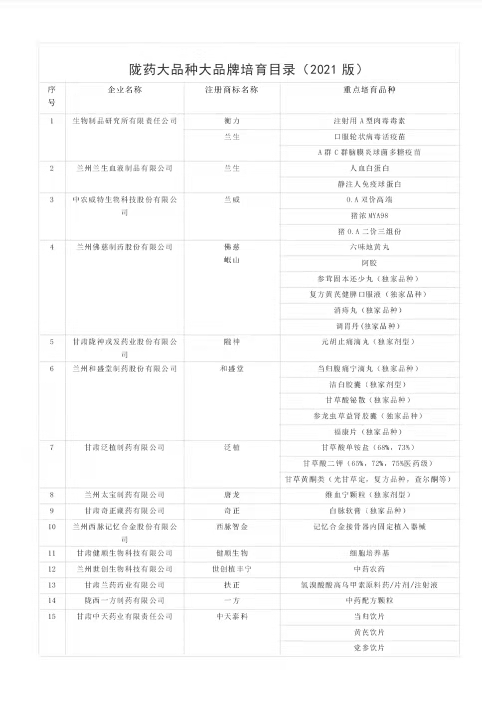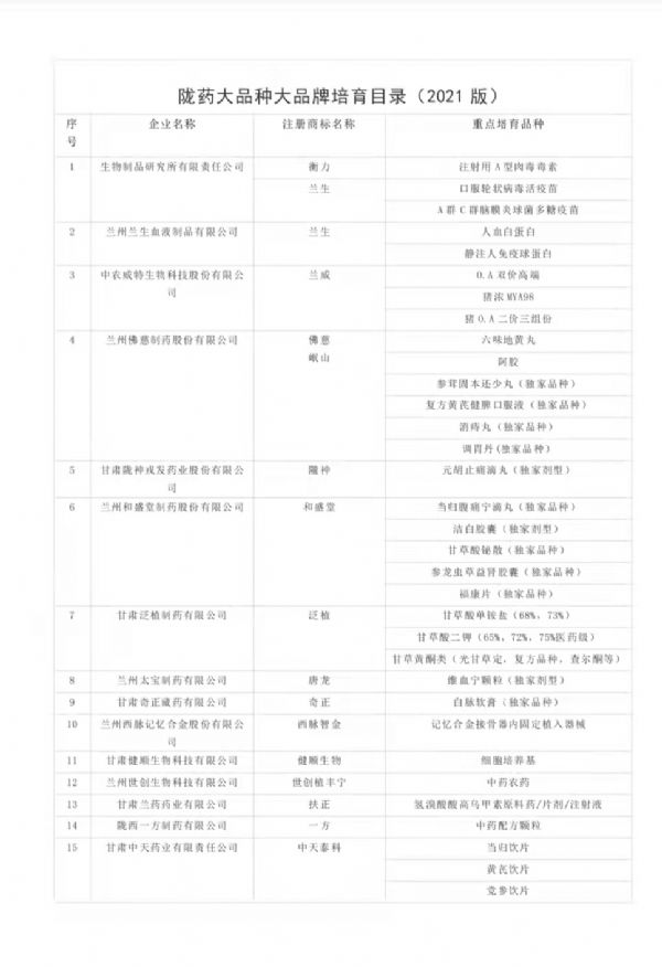 為切實(shí)抓好隴藥大品種大品牌培育工作,根據(jù)《甘肅省人民政府辦公廳關(guān)于支持隴藥大品種大品牌推動(dòng)龍頭企業(yè)發(fā)展政策措施的通知》(甘政辦發(fā)〔2018〕131號(hào))要求,經(jīng)公示無(wú)異,現(xiàn)將隴藥大品種大品牌培育目錄(2021版)予以公告。