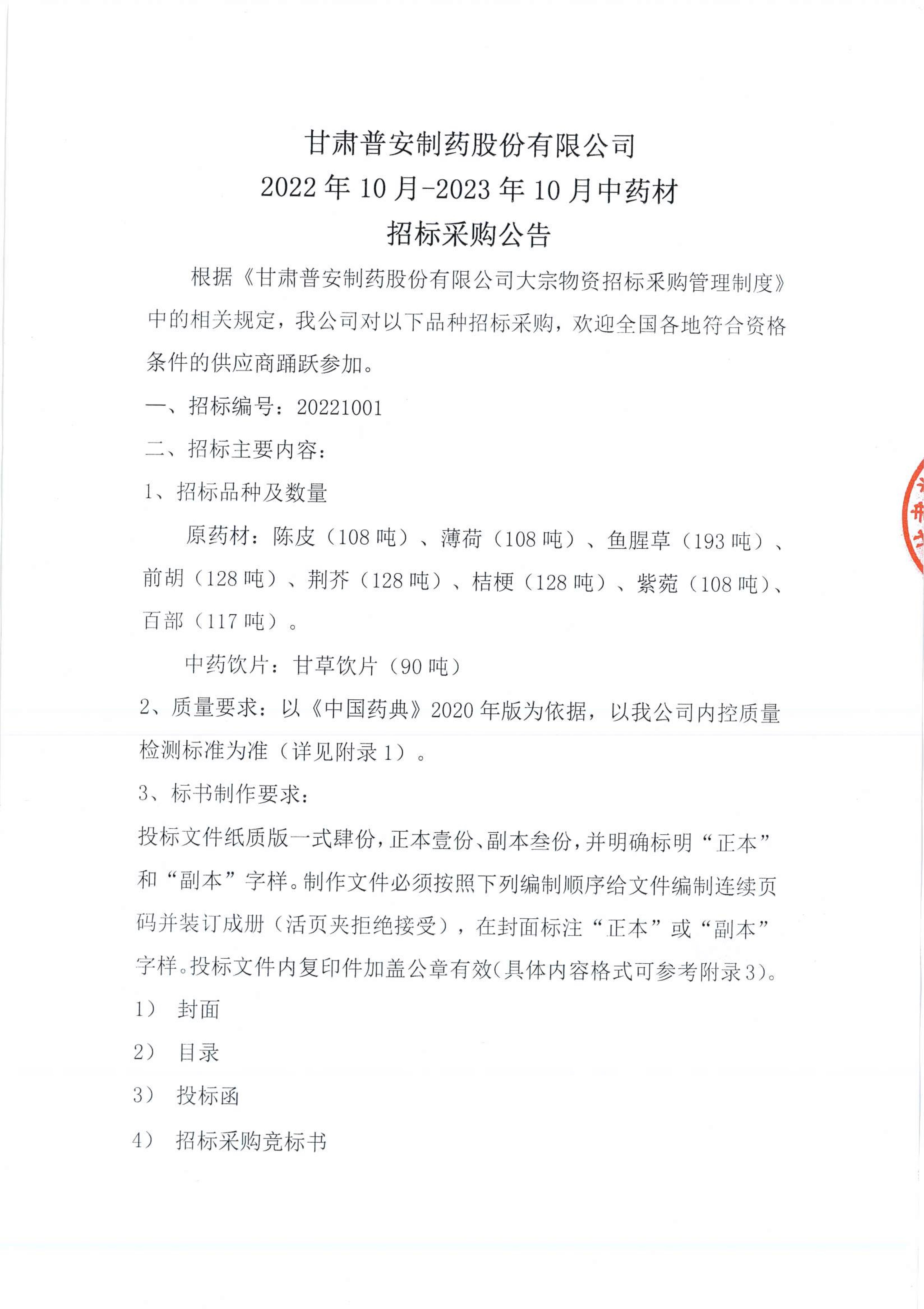 甘肅普安制藥股份有限公司2022年10月-2023年10月中藥材招標采購公告