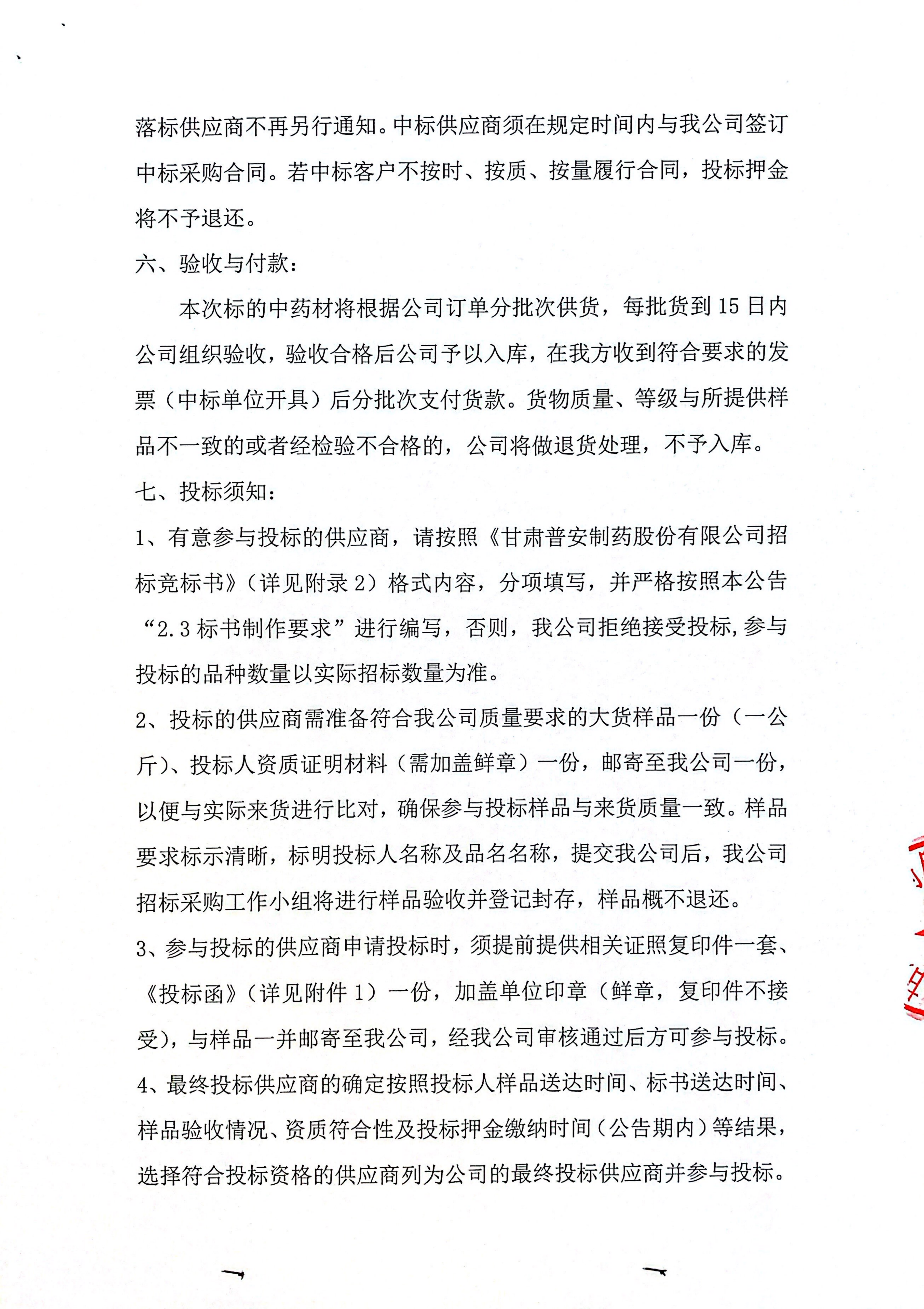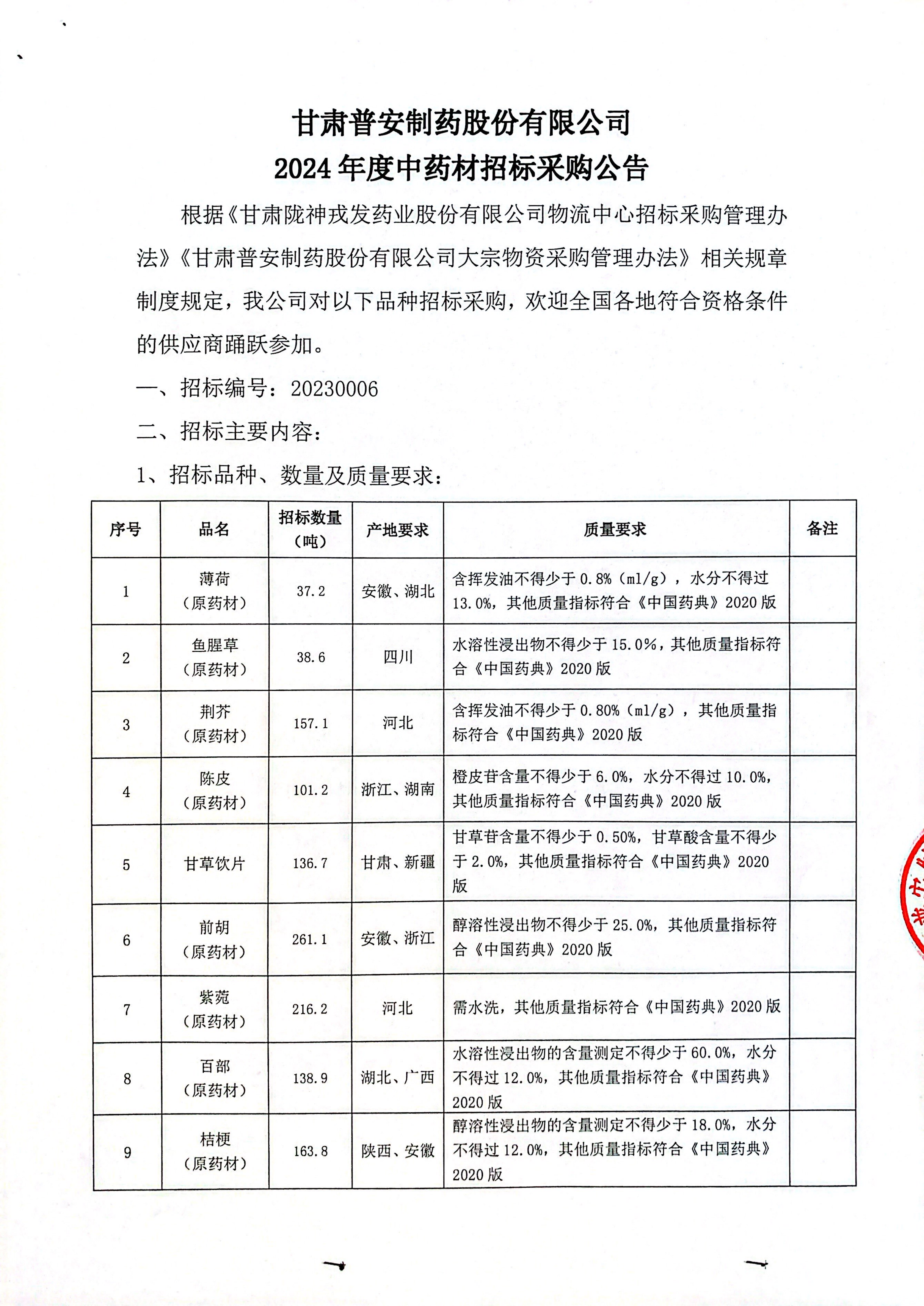 甘肅普安制藥股份有限公司2024年度中藥材招標(biāo)采購公告