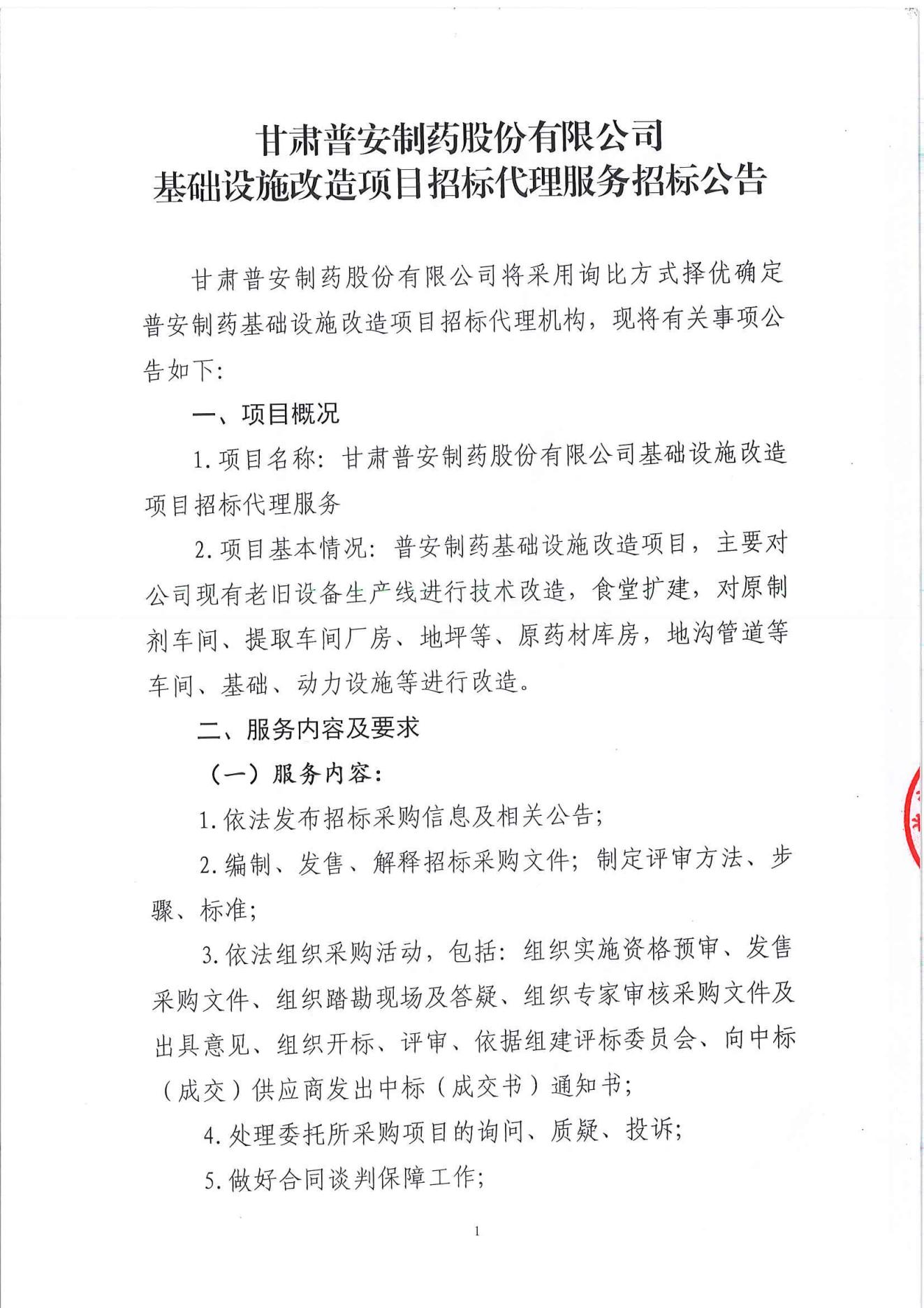 甘肅普安制藥股份有限公司基礎(chǔ)設(shè)施改造項目招標代理招標公告