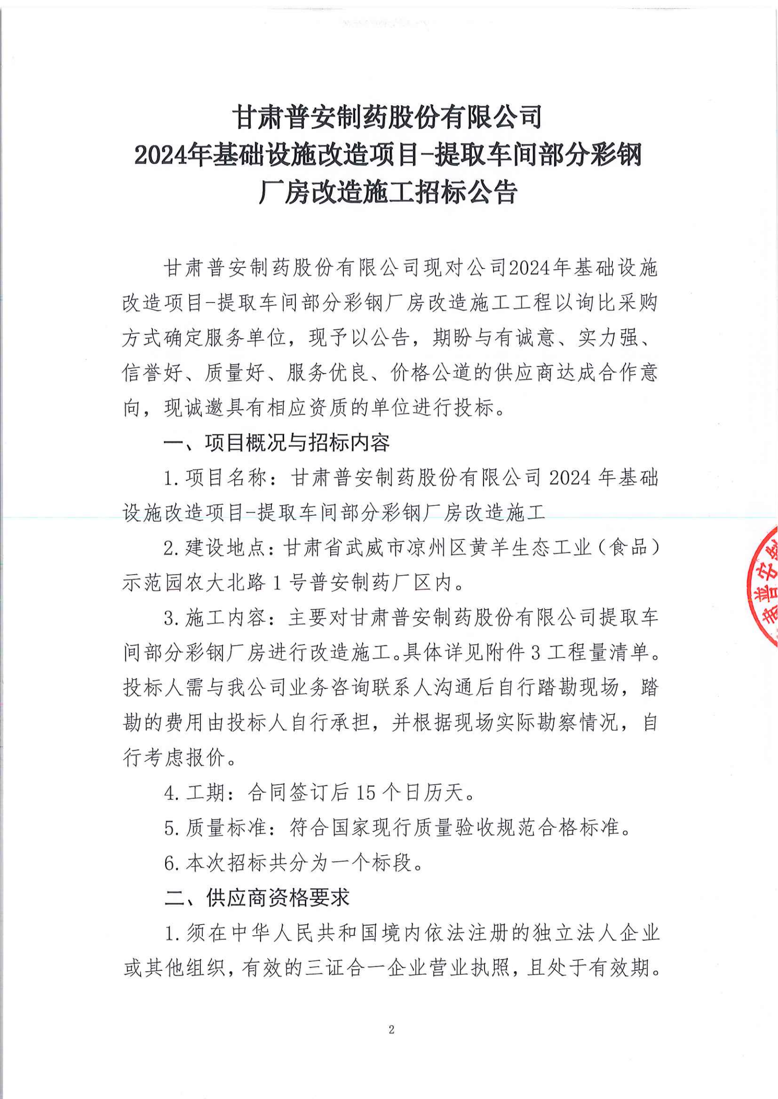 甘肅普安制藥股份有限公司2024年基礎設施改造項目-提取車間部分彩鋼廠房改造施工招標公告