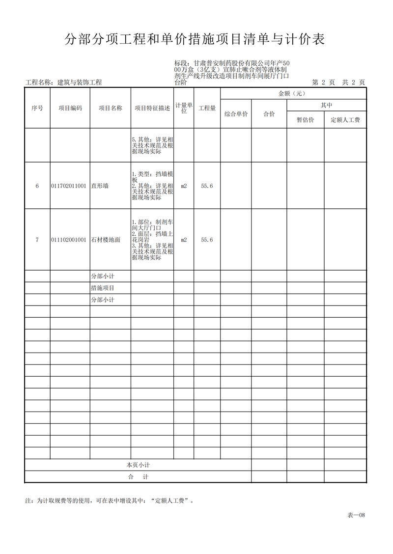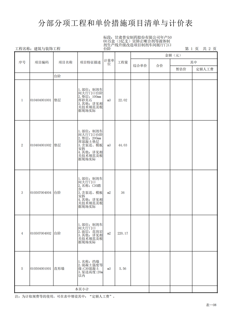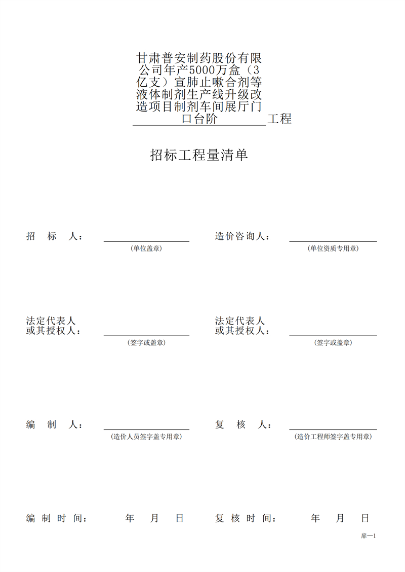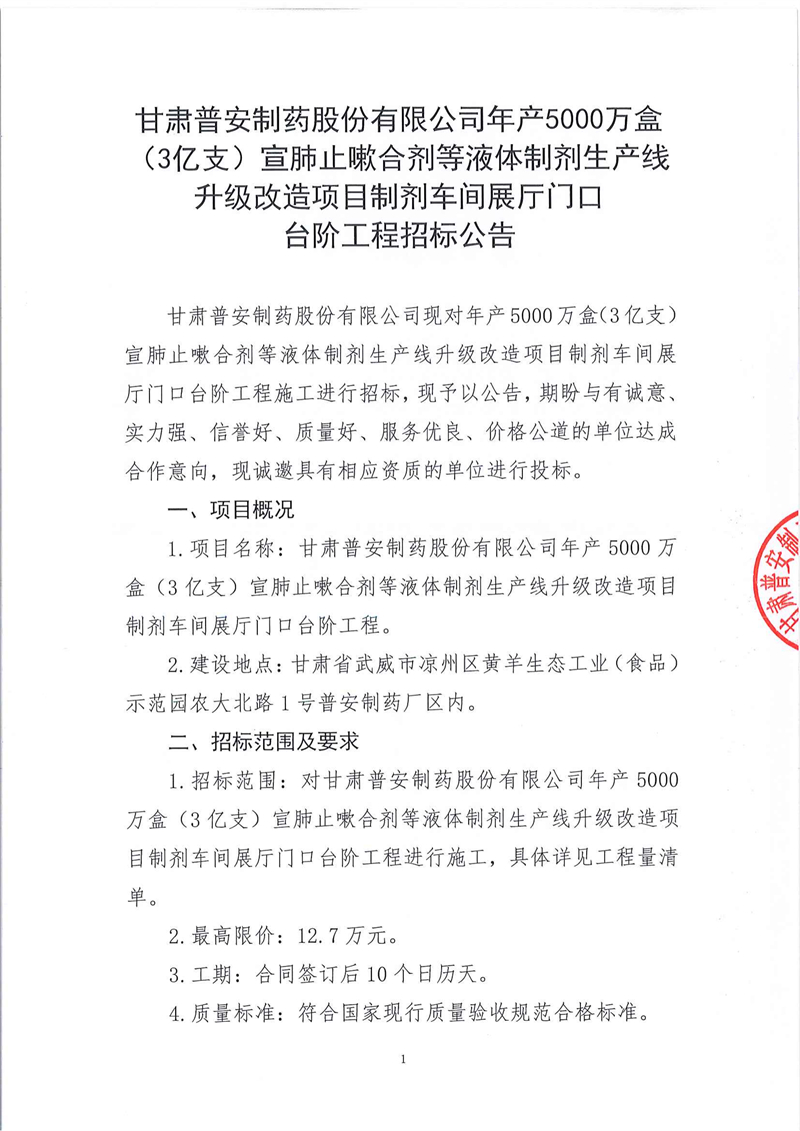 甘肅普安制藥股份有限公司年產(chǎn)5000萬(wàn)盒(3億支)宣肺止嗽合劑等液體制劑生產(chǎn)線升級(jí)改造項(xiàng)目制劑車間展廳門口臺(tái)階工程招標(biāo)公告