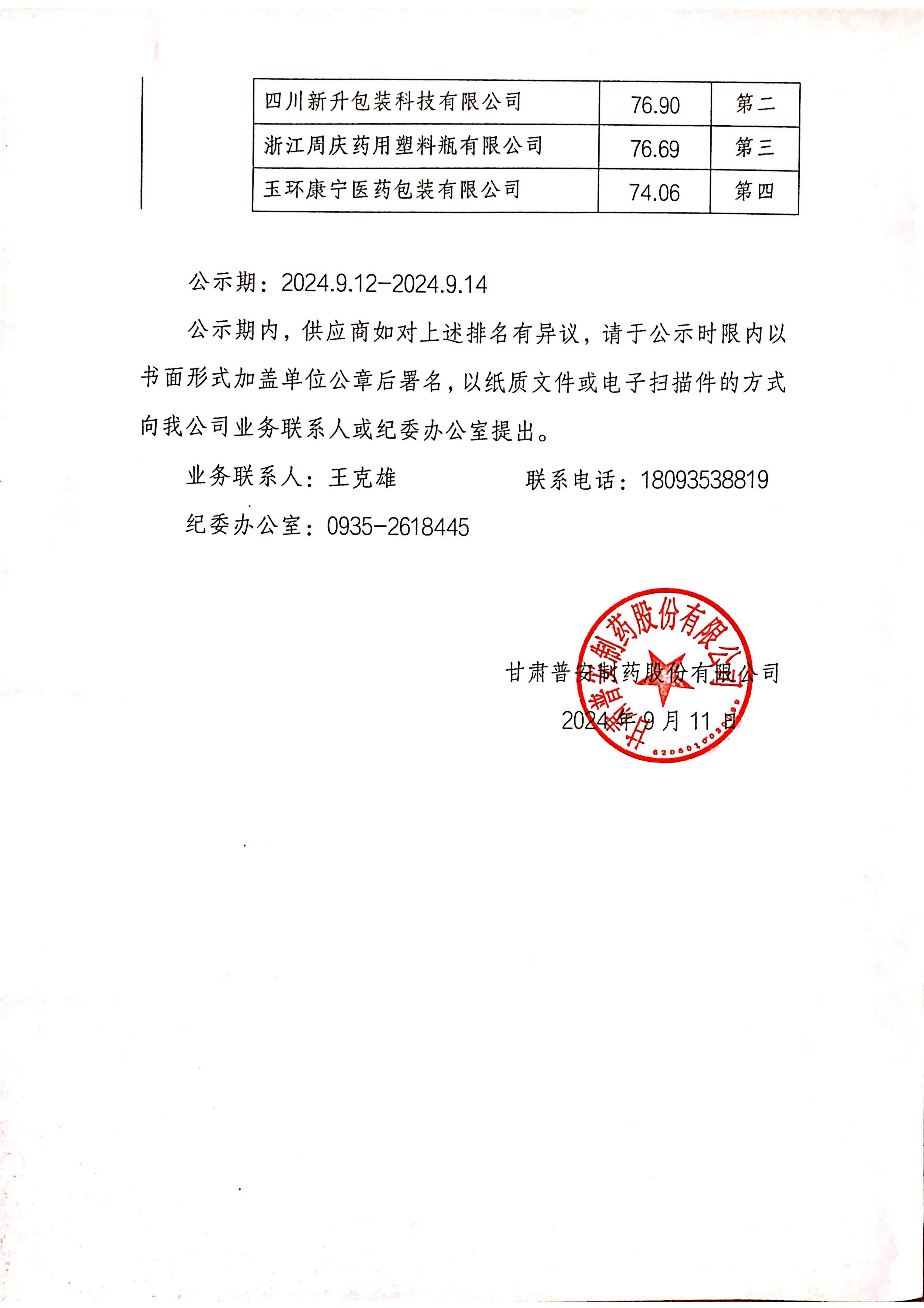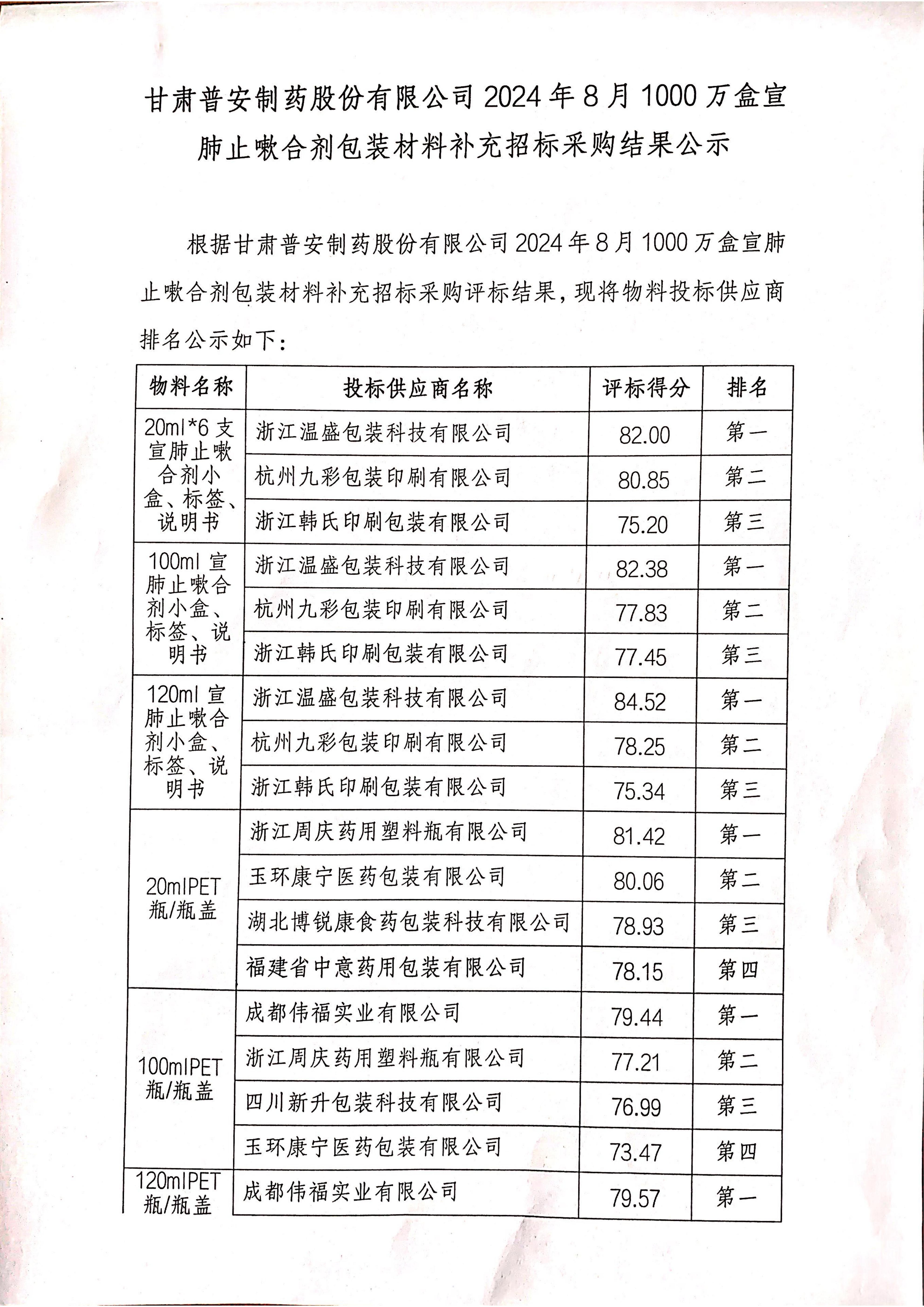 甘肅普安制藥股份有限公司2024年8月1000萬盒宣肺止嗽合劑包裝材料補(bǔ)充招標(biāo)采購結(jié)果公示