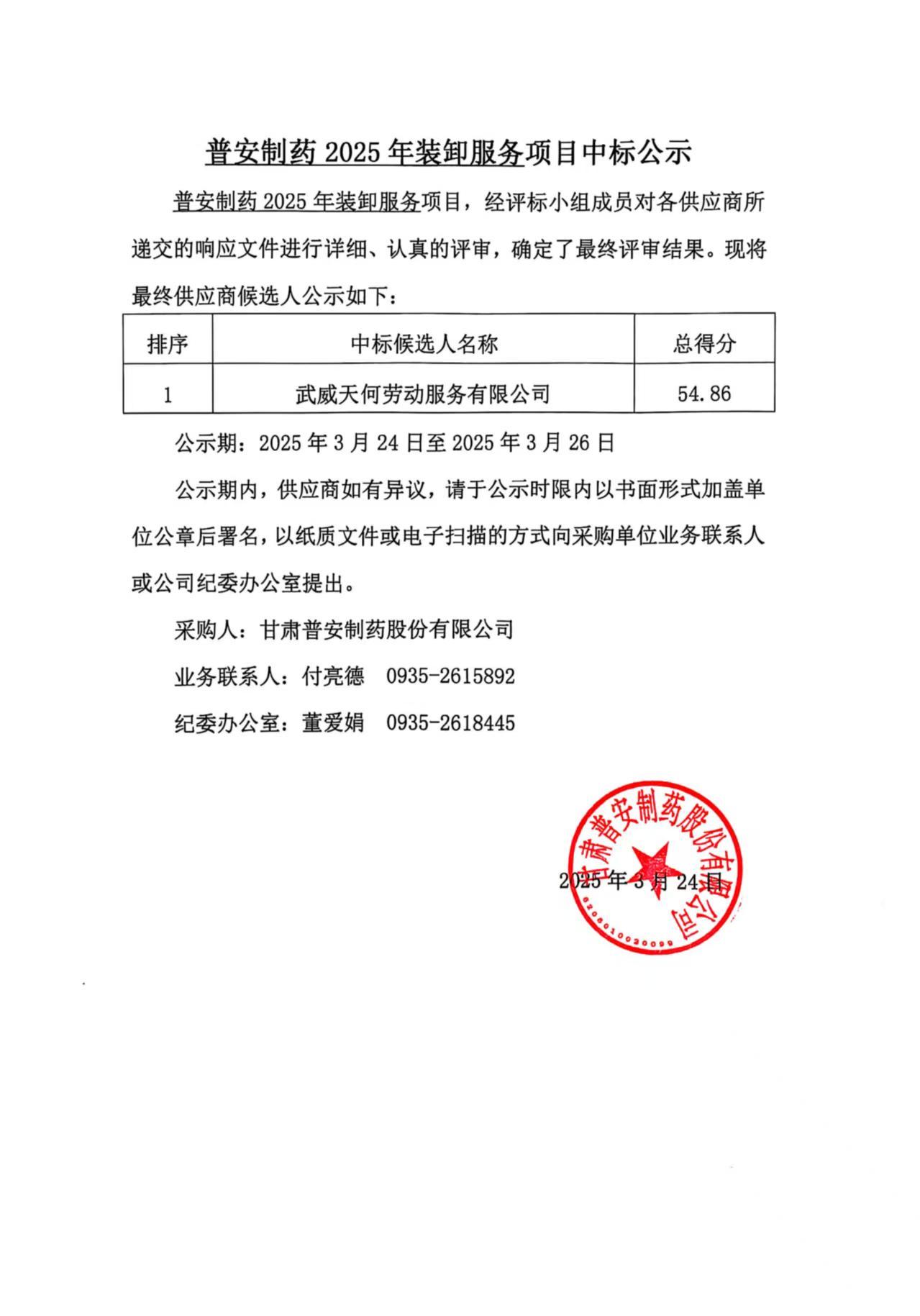 普安制藥 2025 年裝卸服務項目中標公示