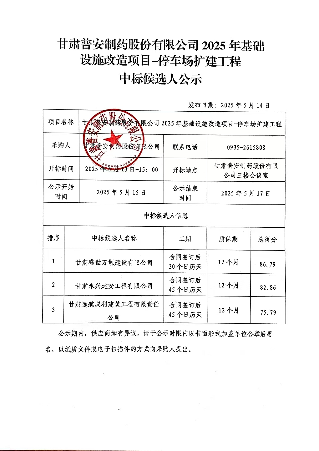 甘肅普安制藥股份有限公司2025年基礎(chǔ)設(shè)施改造項目——停車場擴(kuò)建工程中標(biāo)候選人公示